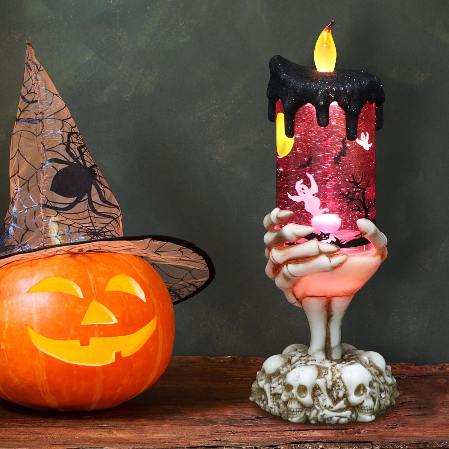 imageEldnacele Halloween Snow Globe Candles Lighted Lamp Battery Operated Spinning Water Glittering Tornado Flameless Candles Table Centerpiece for Halloween Decoration IndoorGhost4Bats Skeleton Hand