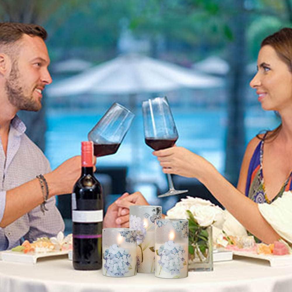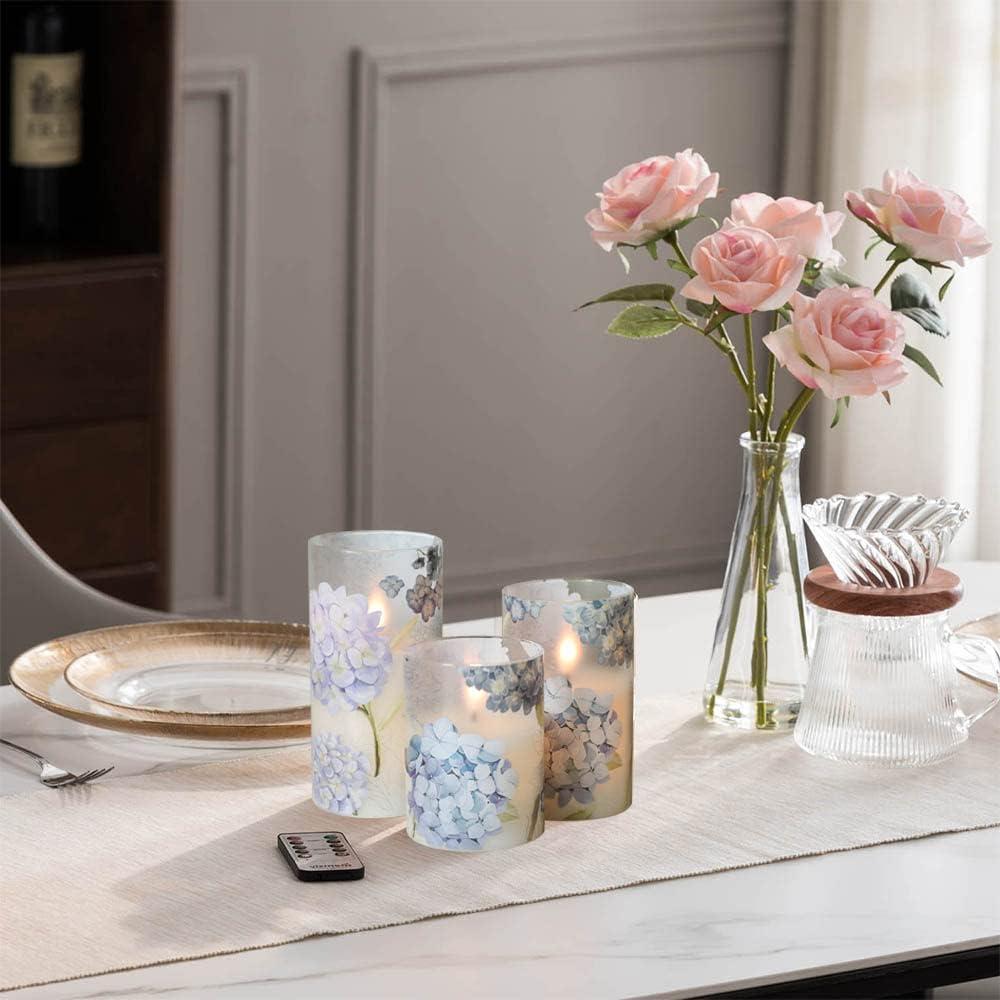 Eldnacele Snowman Glass Flameless Flickering Candles with Remote and Timer, Battery Operated Real Wax LED Pillar Candles Snowman House Decal Christmas Home Indoor Holiday Decor (3Pcs, D3×H4/5"/6")(3- Hydrangea Bule)